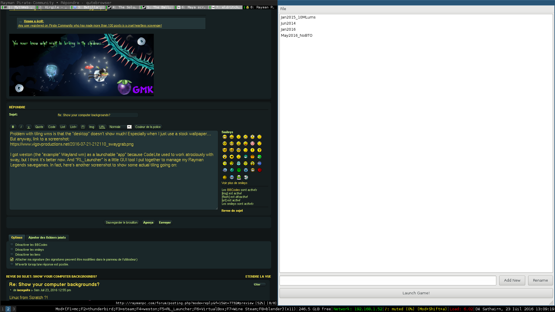 I got weston (the "example" Wayland wm) as a launchable "app" because CodeLite used to work atrociously with sway, but I think it's better now. And "RL_Launcher" is a little GUI tool I put together to manage my Rayman Legends savegames. In fact, here's another screenshot to show some actual tiling going on: https://www.vigovproductions.net/2016-0 ... aygrab.png